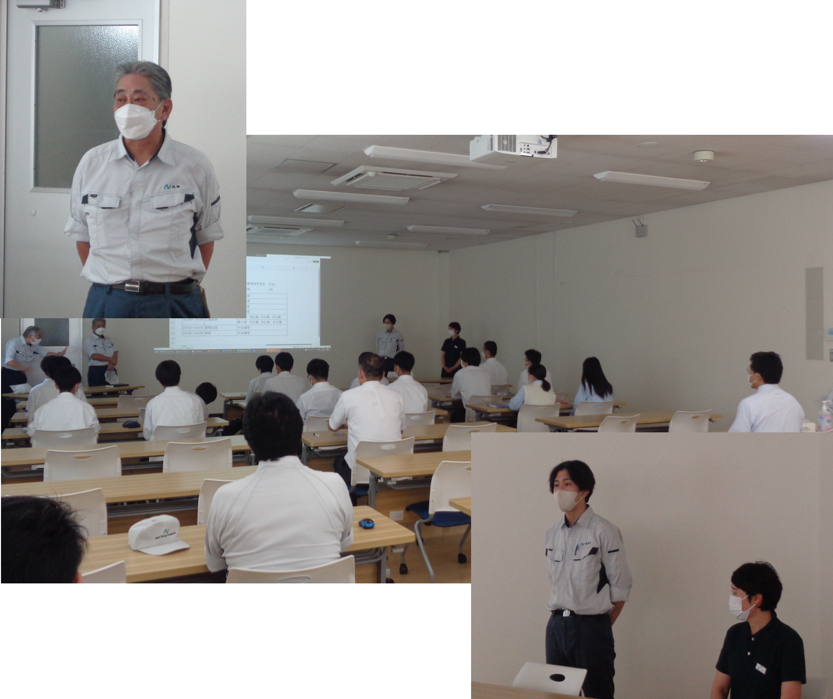 バス到着後、会議室に移動してもらい、社長挨拶の後、会社概要の説明を行い、OB、OGから