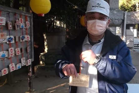 本殿でのお祓い後、社長が「安全第一」と書いた絵馬を奉納し、