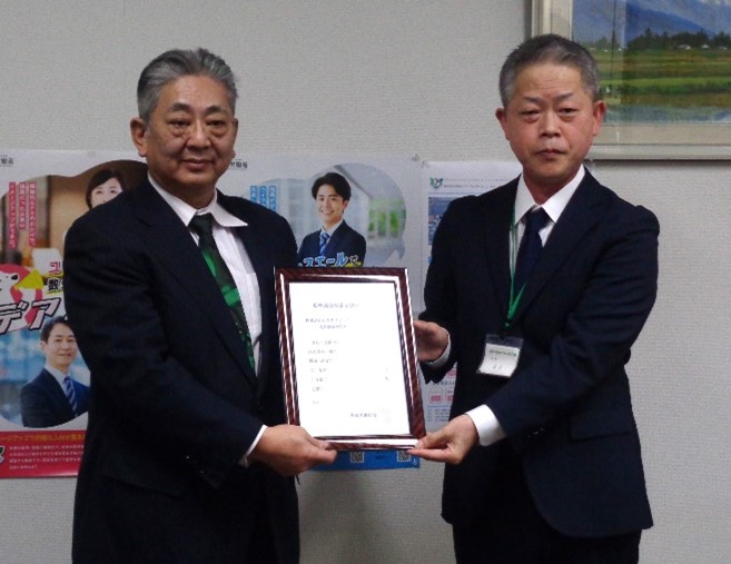 12月15日にハローワーク石岡で、ユースエール「基準適合事業主認定通知書」を、綿引所長(右)から授与されました。