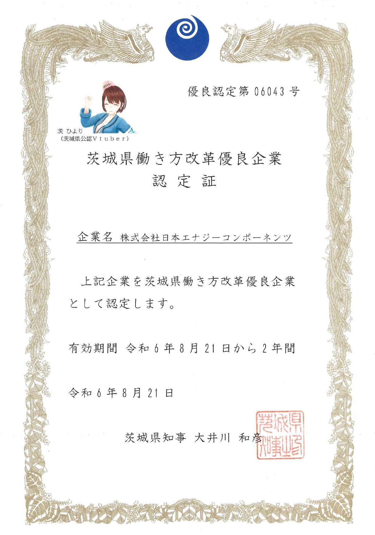 2024年8月21日付で、「茨城県働き方改革優良認定企業」として認定されました。