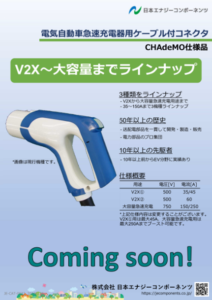 2024.02.14 CHAdeMOコネクタの新機種追加 急速充電用ならびにV2X用コネクタを追加リリースのご案内を報告申し上げます。いずれもEV充電規格 CHAdeMO2.0に準拠した仕様に仕上がっており、従来品と比べて安全性を配慮した設計です。 急速充電用はこれまでのコネクタよりパワーアップしており、電流値を最大250Aまでブーストが実現できます。また、V2X用は2機種リリースを予定しており、いずれも過電流と短絡保護が備わっているので安心設計です。 詳細は下記イメージをクリックしてご参照ください。